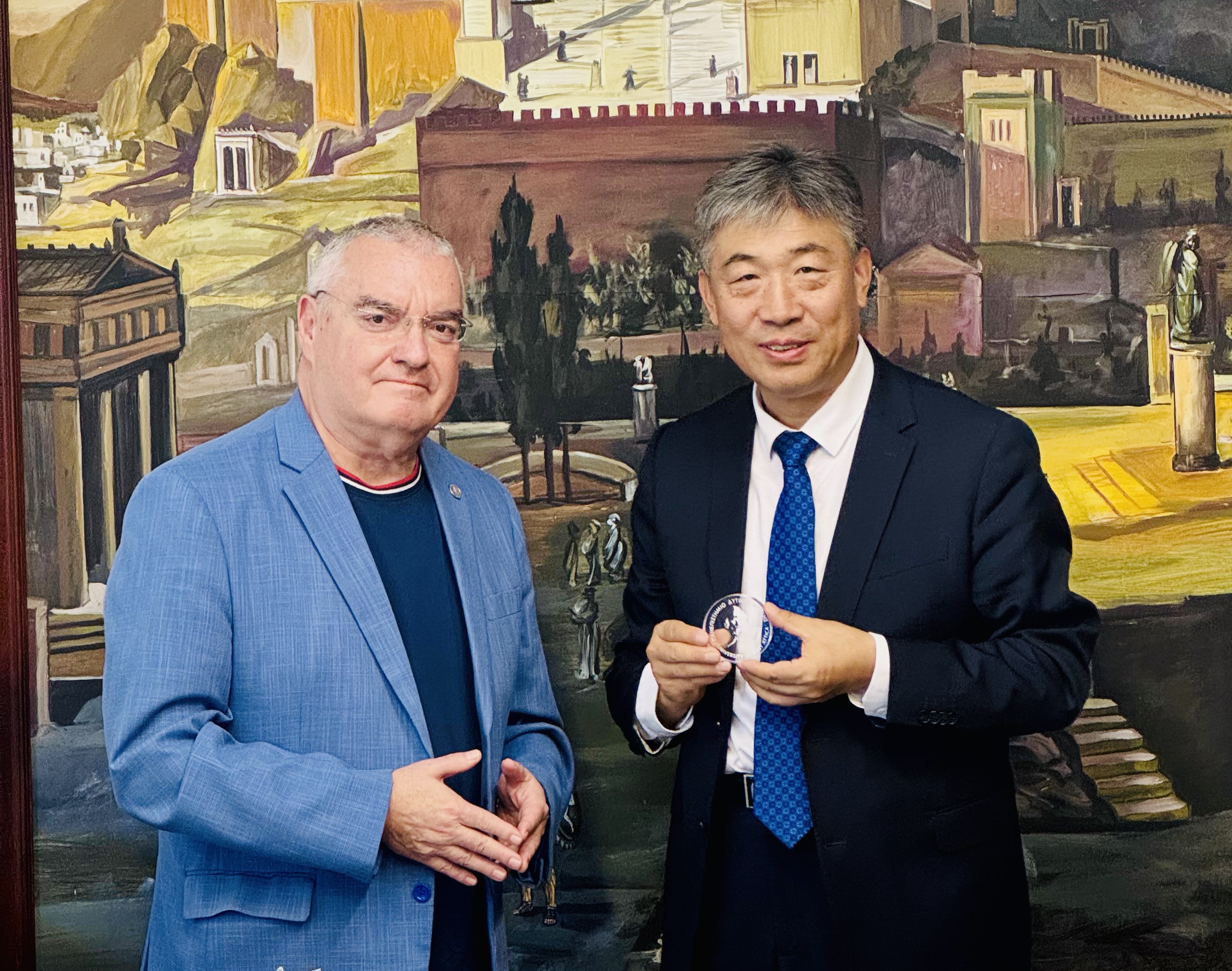 在雅典访问期间,司林胜与西阿提卡大学校长帕纳尤蒂斯·卡蒂斯会晤。司林胜表示,两校在合作和互访中建立了深厚友谊,未来将继续以多种形式推动合作办学、深化区域国别研究、增进中希文明交流互鉴。卡蒂斯代表学校表达了希望与伟德betvlctor深入合作、推动双方师生交流交换与科研协同创新的良好愿望。会谈后,代表团实地走访该校经济与社会科学学院、工程学院、学生科创工作室等教育教学场所。